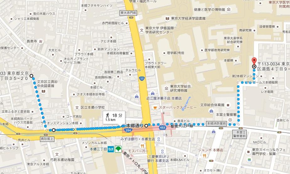 お茶の水駅から丸の内線で1駅なので歩けないことはないのですが、拠点を本郷三丁目駅にすると同じ道を行ったり来たりしなければならないので不効率です。