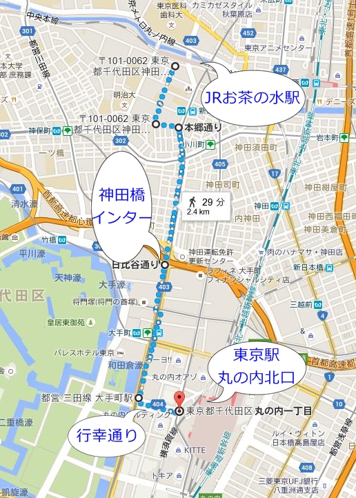 神田橋から丸の内行幸通りまで徒歩約15分くらい、